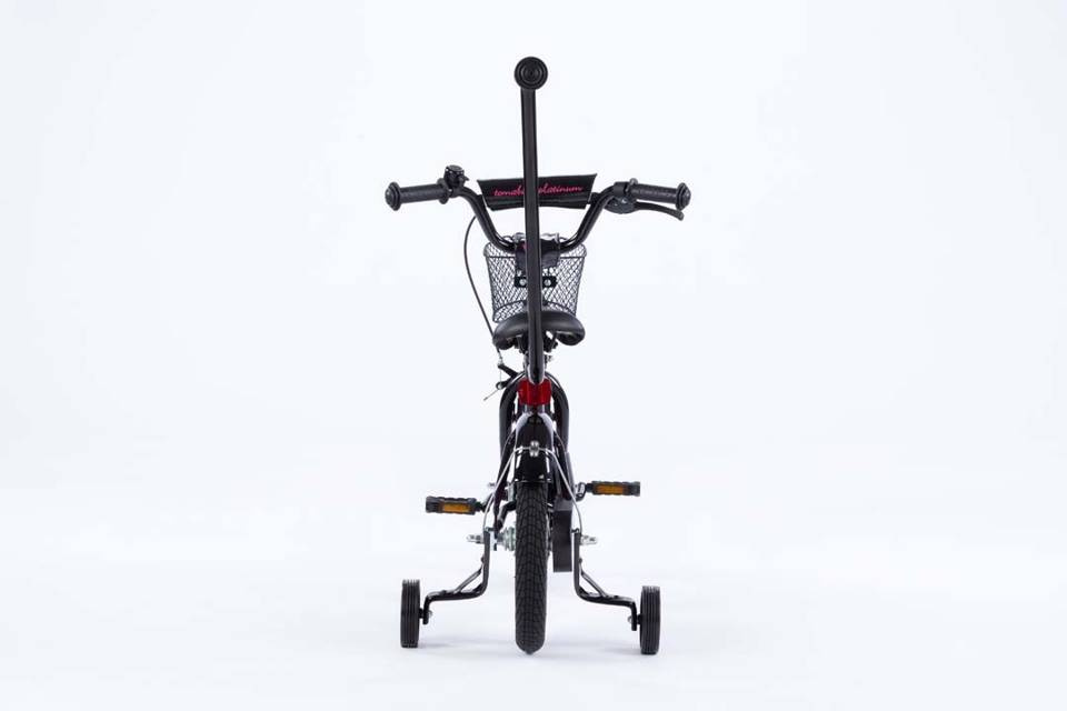 14 calowy rowerek dziecięcy z prowadnikiem TOMABIKE™ w kolorze czarno- różowym. Z pełnym wyposażeniem: prowadnikiem, bocznymi kółkami, koszyczkiem i dzwonkiem. Przeznaczony dla dzieci od ok. 3 roku życia.